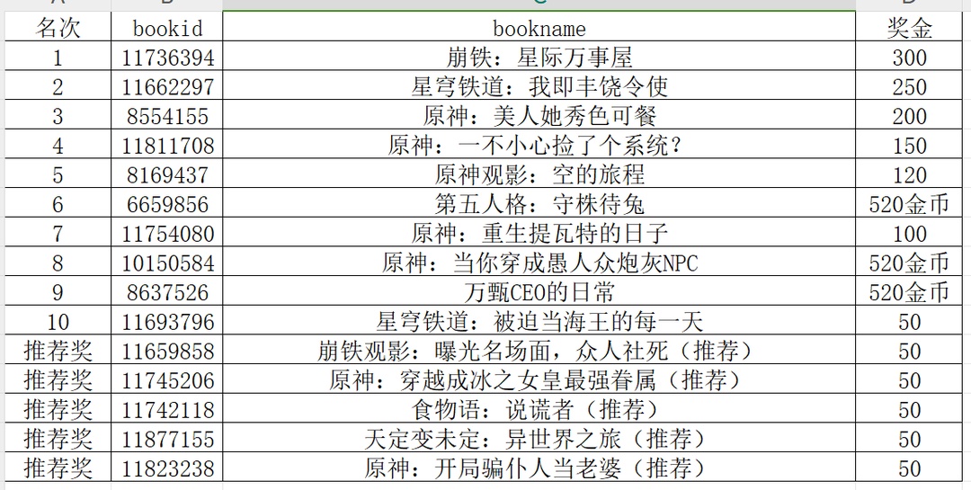 如:书A为老书,最终征文排名为第7名,则取消该书排名及奖金,改为发放520金币以作鼓励