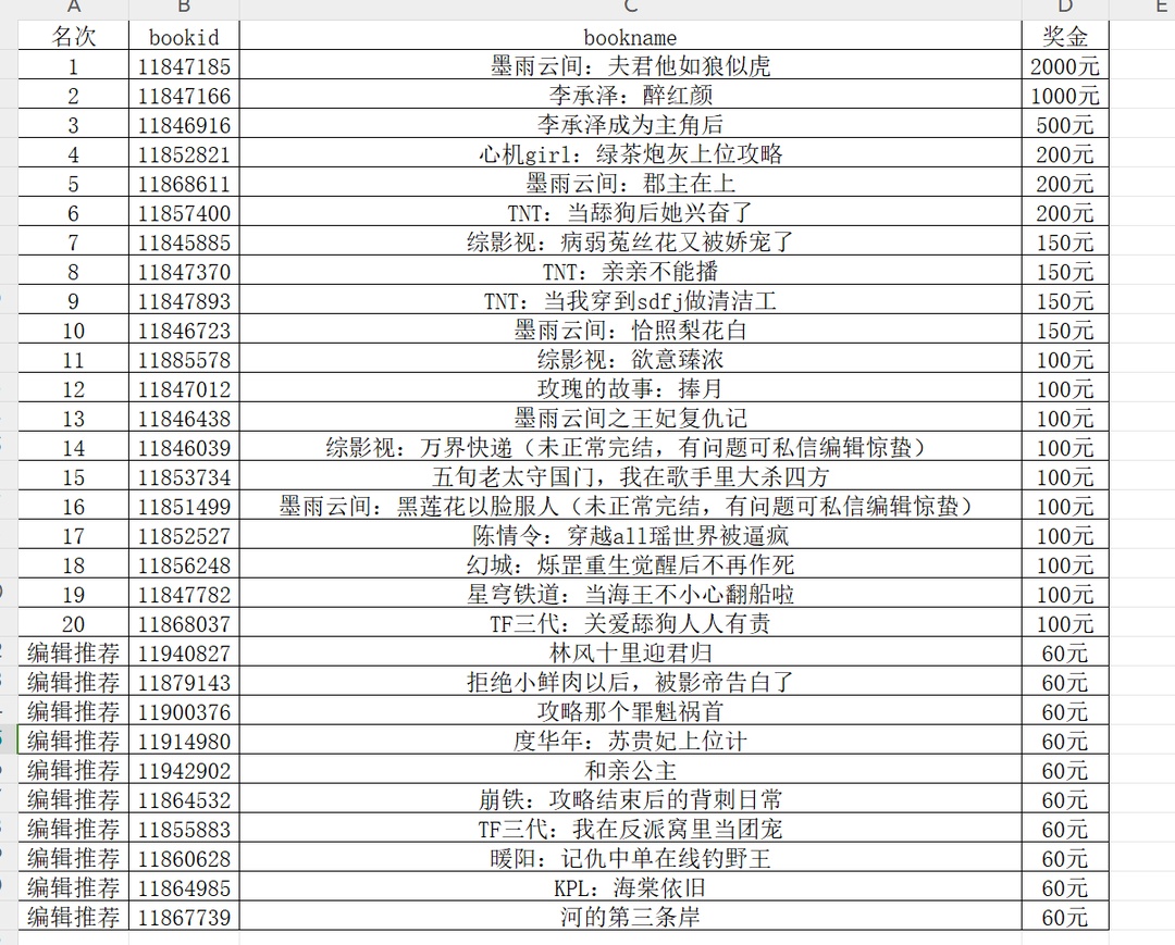 活动期间,对参加精品计划的优质书籍发放精品完本奖励。按照精品计划排名发放(可与排名奖金重复),前200本优质书籍每本均获得20元完本奖励。仅在3~10万字完结的活动作品可领取