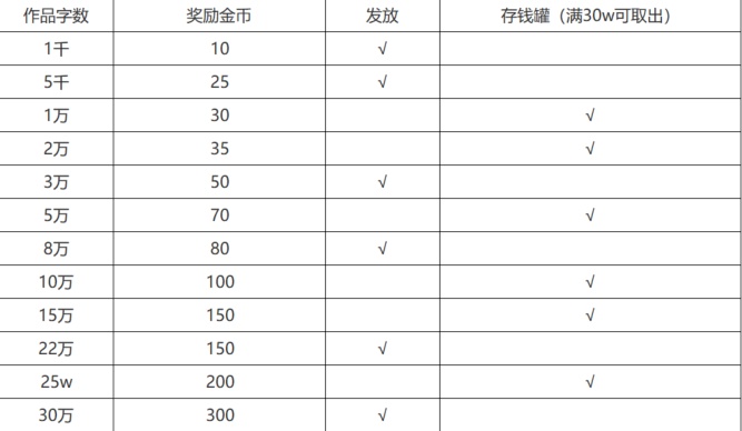 例:当你写到一万字时可获得65金币,35金币已到账,30金币在存钱罐里等你写到三十万字一并提出。